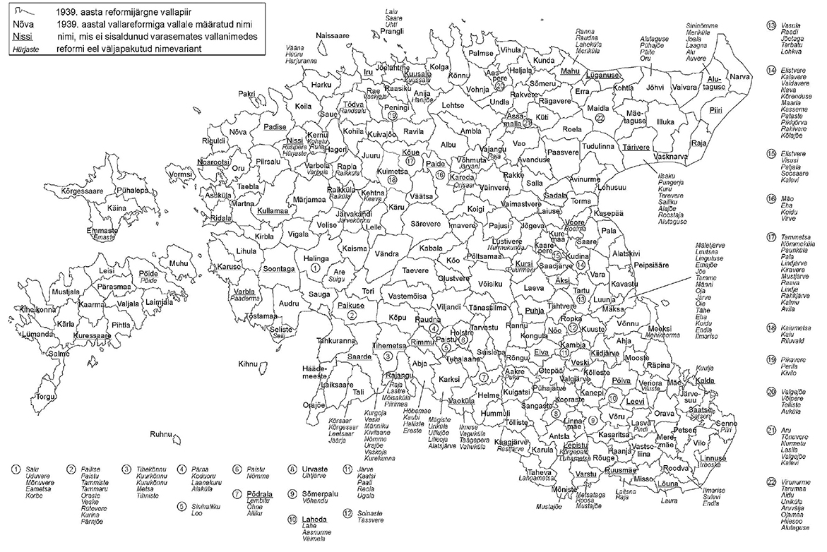 Kaart 1. 1939. aasta vallareformi käigus kasutusele tulnud vallanimed ja eelnevalt pakutud variandid.