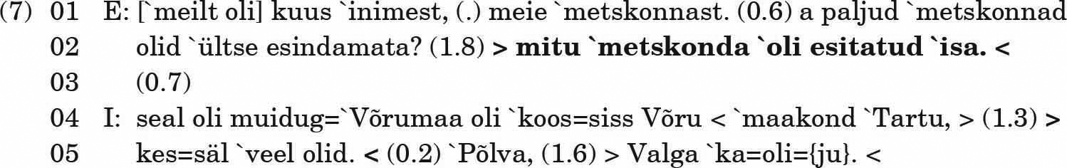 E küsib aja järele küsisõnaga kuna (rida 4). Siin on küsija saanud vormistada infosoovi pelgalt küsisõnaga, sest kuna küsib infot vahetult eelneva vooru kohta ja suhtluses kehtib norm, et vestlejad reageerivad eelnevale voorule (vt Schegloff 2007). Näites 1 järgneb küsimuse esile kutsunud voorule veel paus ja paar vooru (rida 3 ja 4), seetõttu jäänuks pelgalt fraasiga vormistatud küsimus ebaselgeks.