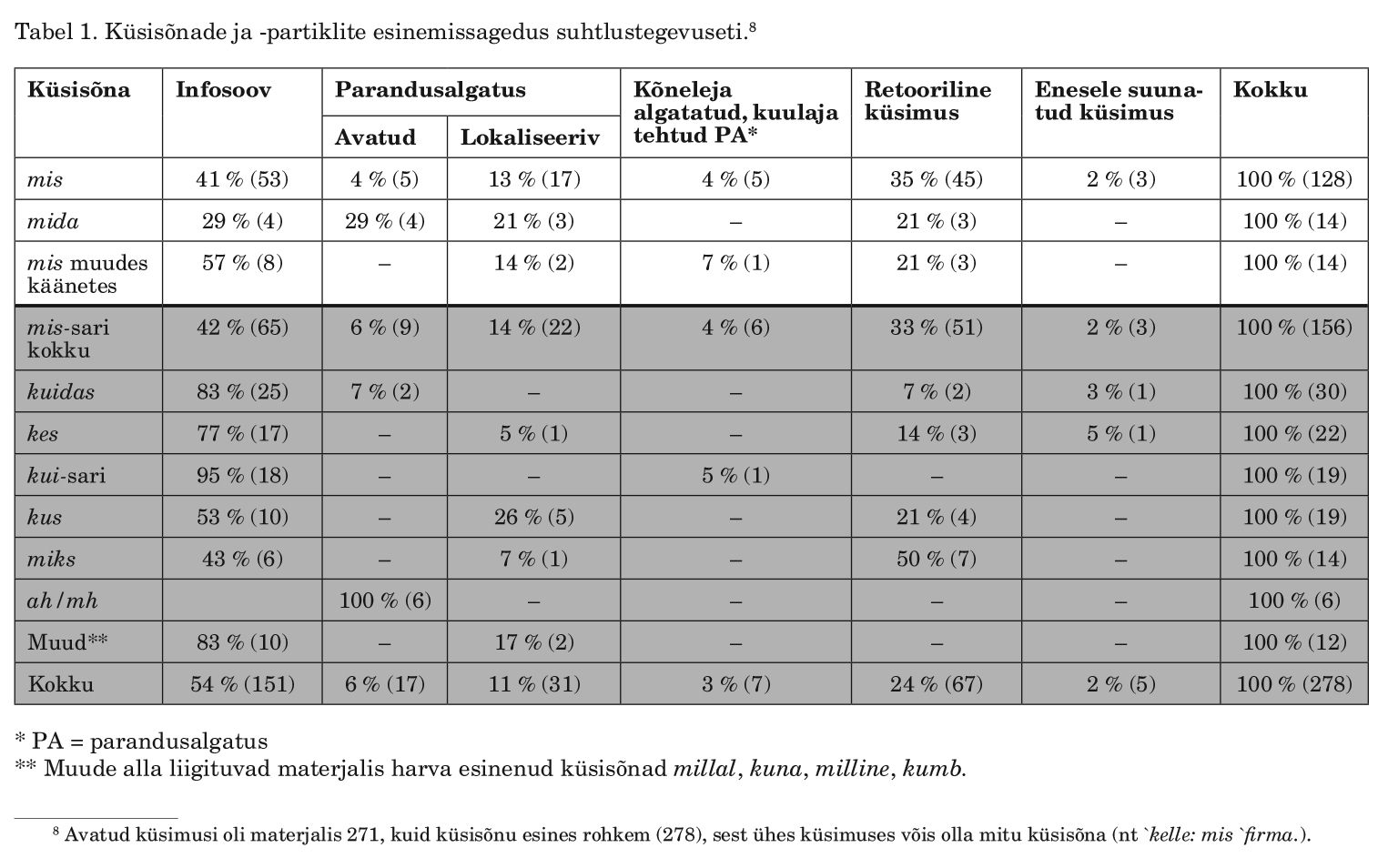 Tabel 1. Küsisõnade ja -partiklite esinemissagedus suhtlustegevuseti.(8)