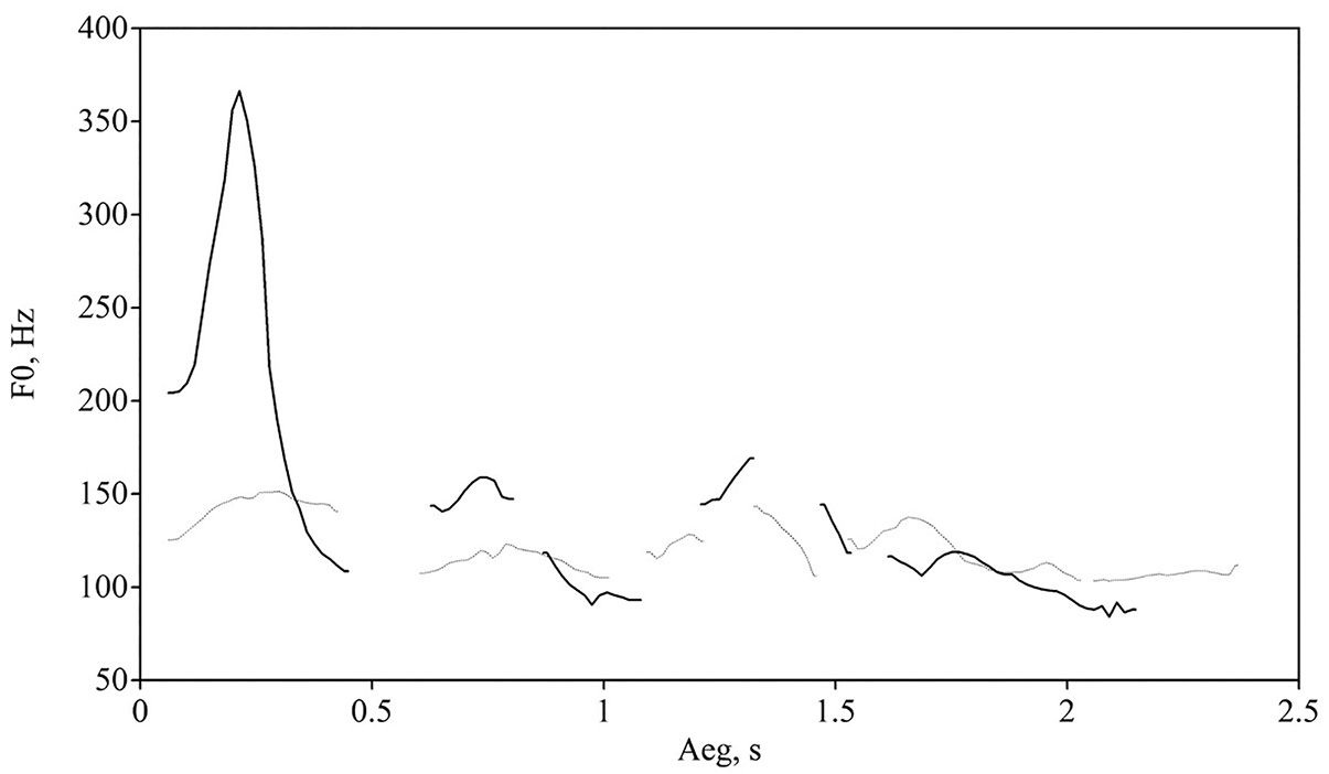 Käesolevas uurimuses on akustiliseks analüüsiks kasutatud igalt keelejuhilt 21 käsitsi märgendatud lauset, kokku 6489 lauset. Lausete kestus jäi vahemikku 4,95 kuni 13,67 sekundit, keskmiselt 7,8 sekundit. Kõne põhitooni (F0) automaatseks leidmiseks koostati vastavad Praati skriptid. F0 analüüsil kasutati kaheastmelist protseduuri (Hirst 2007), kus esmalt leiti iga lause F0 väärtused sagedusvahemikus 75 kuni 600 Hz, seejärel kitsendati sageduspiirkonda vastavalt kõneleja F0 varieerumisele järgmiselt: F0max = 1,5 x 3. kvartiili väärtus, F0min = 0,75 x 1. kvartiili väärtus. Selline keelejuhi F0 sagedusdiapasooni arvestav meetod vähendab vigu F0 leidmisel ja annab seega usaldusväärsemaid tulemusi. Siiski tuli käsitsi üle mõõta ca 20 % lausetest, mille automaatselt leitud F0 väärtused näisid ebatõenäosed, nt kui poiste kõnes leiti maksimaalsed F0 väärtused üle 400 Hz või tüdrukutel minimaalsed F0 väärtused alla 150 Hz. F0-algoritm töötas paremini vanemate poiste ja tüdrukute kõne puhul, kes lugesid etteantud lauseid suhteliselt monotoonselt (vt joonist 2, hall joon), nooremad keelejuhid olid kohati väga püüdlikud ja lugesid lauseid „ilmekalt” (nii nagu algklassides sageli nõutakse), mistõttu nende suurem F0 varieeruvus põhjustas rohkem automaatse F0-algoritmi vigu. Samuti esines rohkem vigu suurema mürataustaga salvestustes ja häälemurdeeas olevate poiste kõnes, kus põhitooni variatsioonid ongi suuremad ja ulatuvad kohati falsetiregistrisse (vt joonist 2, must joon).