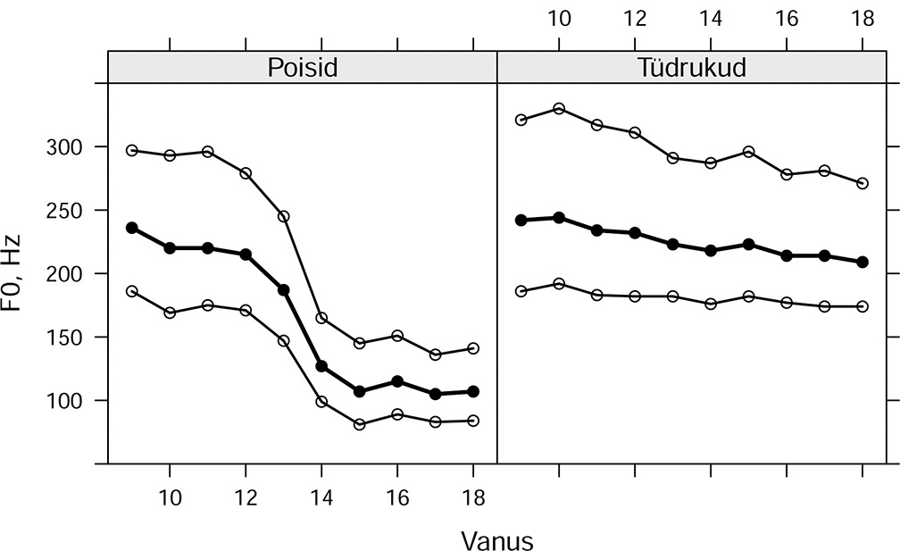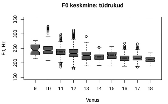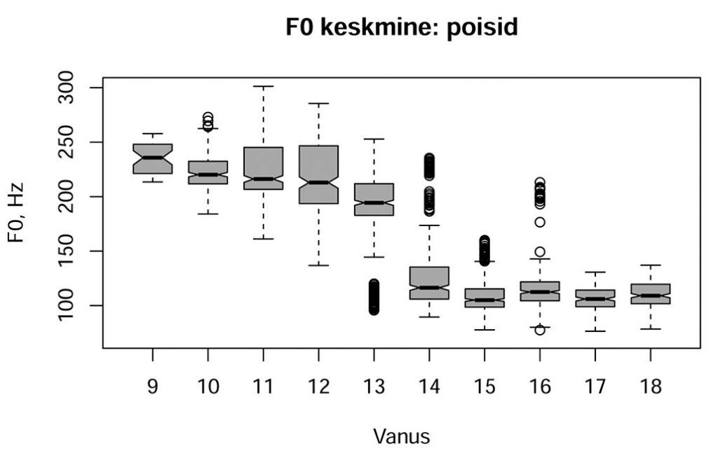 Artiklis uurisime lausete ettelugemisel salvestatud kõne F0 statistilisi näitajaid ja nende muutust sõltuvalt vanusest ja soost. Leidsime, et poistel vanuses 9–12 langeb keskmine F0 väärtus järk-järgult 235 Hz-lt 217 Hz-ni (18 Hz võrra), vanuses 12–15 leiab aset F0 väärtuse hüppeline langus 108 Hz võrra 217 Hz-lt 109 Hz-ni, kusjuures suurim langus (61 Hz) toimub vahemikus 13–14 aastat; vanuses 15–18 leitud F0 varieerumine vahemikus 107–117 Hz pole statistiliselt oluline. Tüdrukute keskmine F0 väärtus langeb vanuses 9–18 järk-järgult 245 Hz-lt 212 Hz-ni (33 Hz võrra).