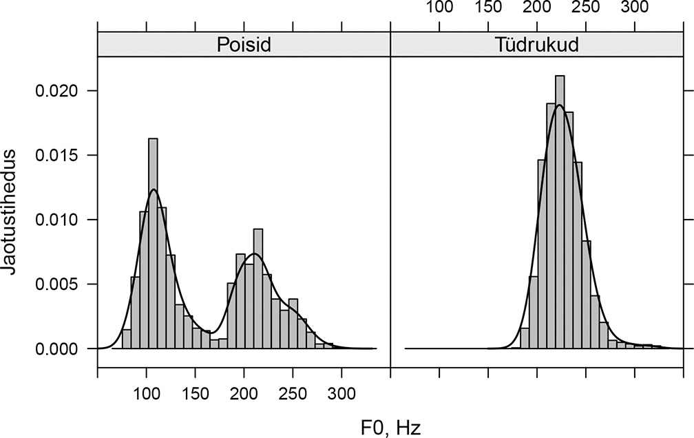 Histogrammid (joonis 6) näitavad F0 keskväärtuse esinemissageduse jaotust poistel ja tüdrukutel. Poistel on binominaalne jaotus, milles eristuvad selgelt kaks maksimumi: 105 Hz ja 215 Hz. Neist esimene vastab häälemurde läbinud poiste sagedaseimale F0 keskväärtusele (poisid vanuses 15–18, F0 mediaan = 108 Hz), teine nooremate poiste (vanuses 9–12, F0 mediaan = 218 Hz), kellel pole häälemurre veel alanud, sagedaseimale F0 keskväärtusele. Tüdrukute F0 keskväärtuse jaotuses on ootuspäraselt ainult üks maksimum (225 Hz), mis on praktiliselt võrdne kõigi tüdrukute F0 mediaanväärtuste keskmisega (226 Hz).