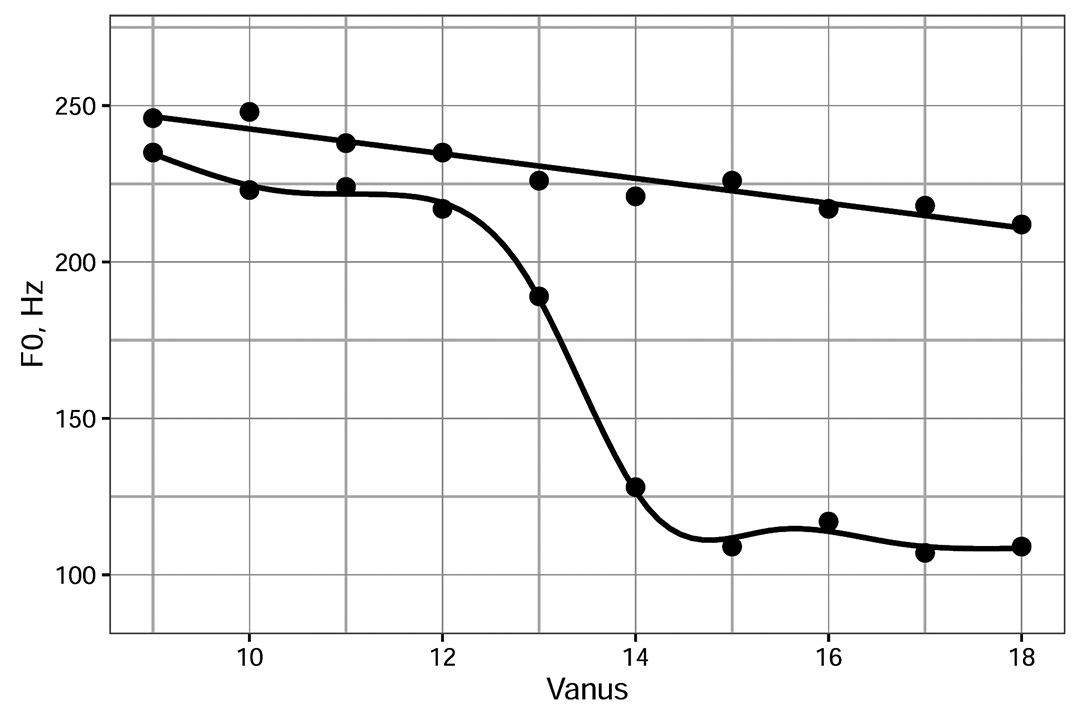 Saadud F0 andmestikule tuginedes on leitud üldistavad lineaarse regressiooni kõverad, mis esitavad F0 keskmise muutust sõltuvalt keelejuhi vanusest ja soost (joonis 4). Kui tüdrukute F0 keskmise muutust sõltuvalt vanusest kirjeldab piisavalt hästi lineaarne funktsioon (F[1, 8] = 94, p < 0,001; R2 = 0,92), siis poiste F0 andmete kirjeldamisel andis parimaid tulemusi tükiti interpoleerimine splain-funktsioonidega (F[2, 7] = 231, p < 0,001; R2 = 0,99).
