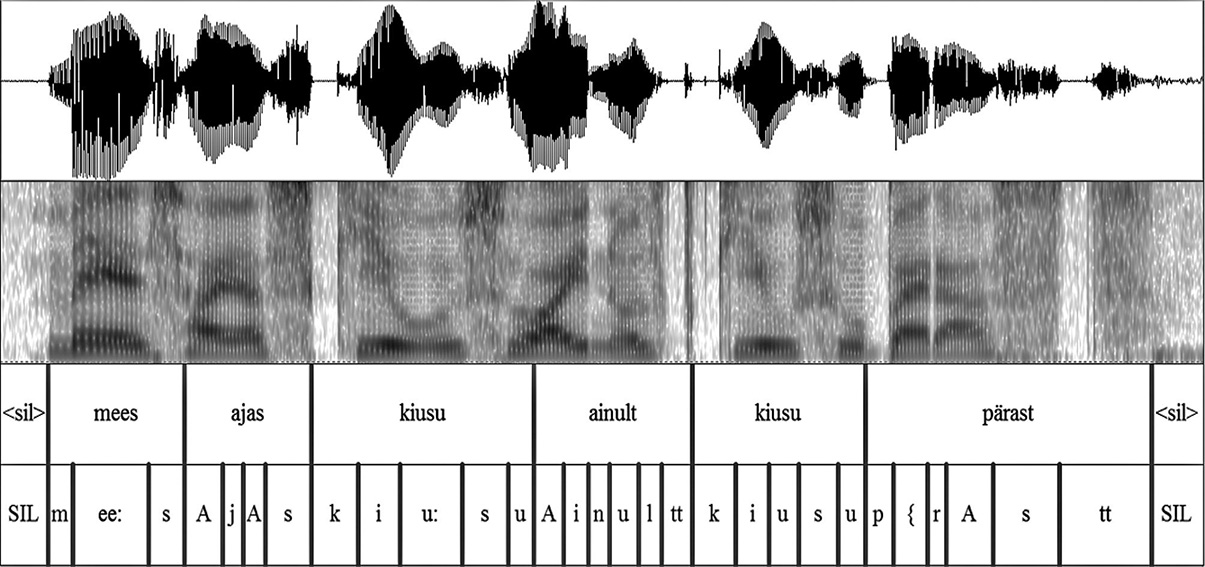J o o n i s 1. Lause „Mees ajas kiusu ainult kiusu pärast” helilaine (ülemine), spektrogramm (ülalt teine) ja segmenteerimine sõnadeks (alt teine) ning häälikuteks (alumine). Häälikutasandil kasutatakse SAMPA transkriptsiooni.