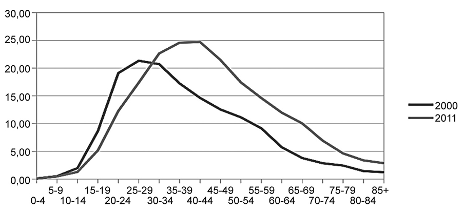 Joonis 1. Soome keele oskus Eestis vanusrühmade (5-aastased kohordid) kaupa 2000. ja 2011. aasta rahvaloenduse andmetel.