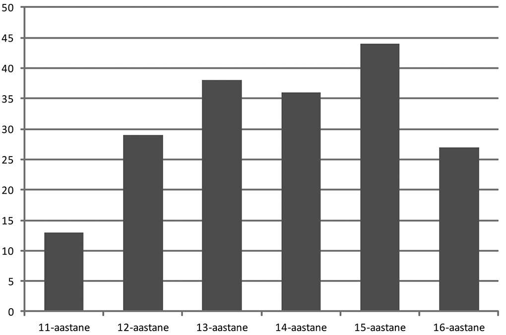 188 vastanust 60 oli Jõgevalt, 13 Tartust, 52 Pärnust ja 63 Viljandist. Vanuseliselt leidus kõige rohkem 15-aastaseid – 44, 13-aastaseid oli 38, 14-aastaseid 36, 12-aastaseid 29 ja 16-aastaseid 27. 11-aastaseid oli 13. Vastajate vanuseline jaotus on näha joonisel 1. Vastajatest olid 100 tüdrukud (53 %) ja 88 poisid (47 %).