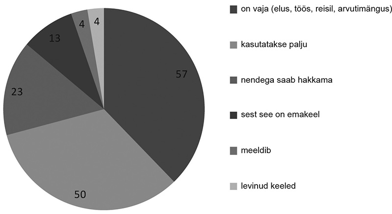 Kuna küsimusele sai vastata vaba tekstiga, siis varieerusid vastused küllaltki suures ulatuses. Siiski on võimalik välja tuua mõned olulisemad põhjused (vt joonist 4). Kõige sagedamini põhjendati valikut praktilise vajadusega: neid keeli läheb vaja elus või siis kitsamalt – töös, reisil või näiteks arvutimängus. Üle veerandi vastanutest põhjendas oma valikut sellega, et neid keeli räägitakse või kasutatakse palju, kas siis Eestis või mujal maailmas. 23 õpilast ehk 12 % vastanutest väitis, et nende nimetatud keeltega saab elus hakkama. 14 tõi põhjenduseks, et see on nende emakeel, ja üks, et tegemist on riigikeelega. Neli vastajat tõi põhjuseks, et keel lihtsalt meeldib. Põhjusena nimetati näiteks „et ma ei näeks loll välja nendes riikides” või „tahan teiste maade inimestega rääkida”.