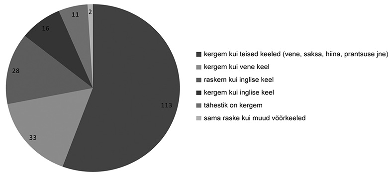 Üldiselt peeti soome keelt teistest võõrkeeltest lihtsamaks. Sageli toodi võrdlusena (raskema keelena) välja vene keel, aga ka saksa, hiina ja prantsuse keel. Neist, kes soome keele raskust inglise keelega võrdlesid, leidsid 16, et soome keel on kergem, ja 28, et raskem kui inglise keel. 33 vastajat pidasid soome keelt vene keelest kergemaks. Lisaks mainis 11 õpilast, et soome keele tähestik on (vene keelest) kergem. Märkimisväärne ongi asjaolu, et õpilased nimetasid keele õppimise kerguse või raskuse puhul tähestiku erinevust. Tõenäoliselt on see üks silmatorkav tunnus, mida keelt tundmata on võimalik kindlaks teha. Kaks õpilast leidis, et soome keel pole ei kergem ega raskem kui muud võõrkeeled.