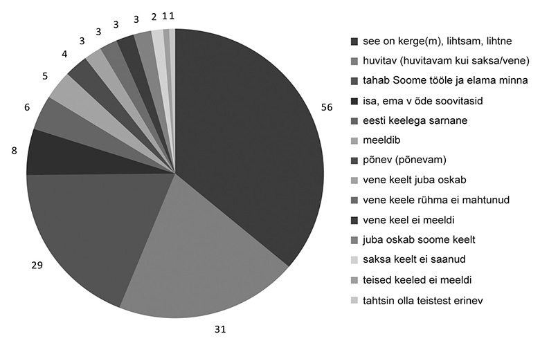 Sellele küsimusele vastas ligi kolmandik õpilasi, et soome keel on võrreldes teiste valikuvõimalustega (peamiselt siis vene ja saksa keelega) kergem või lihtsam. 31 õpilast märkis, et soome keel on huvitav(am) kui vene või saksa keel, 29 tahavad Soome tööle ja elama minna. Kaheksa õpilast viitas valiku põhjusena mõne lähisugulase (ema, isa, õe, venna) soovitusele. Viis õpilast nimetas põhjusena seda, et soome keel on neile meeldiv, ja neli, et soome keel on põnev. Kolm õpilast vastas, et vene keelt nad juba oskavad ja seetõttu valisid soome keele (vastajate seas oli seitse õpilast, kelle üks kodukeeltest on vene keel). Kolm õpilast teatasid põhjusena, et vene keel neile ei meeldi. Üksikud vastasid, et saksa keelt ei saanud mingil põhjusel õppida (kuigi oleks tahtnud), soome keele õpetaja oli hea või et õpilane tahtis olla teistest erinev. Üks õpilane vastas ka, et valis soome keele seetõttu, kuna juba oskas seda. Vastuste jaotust võib näha joonisel 6.