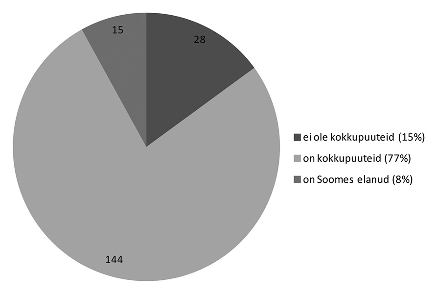 Sellele küsimusele vastas vaid 28 õpilast (15 %), et kokkupuuteid ei ole üldse või peaaegu üldse olnud. Ülejäänud vastajatel oli rohkem või vähem varasemaid kokkupuuteid. 15 õpilast (8 %) olid varem Soomes elanud, lisaks leidus neid, kes olid viibinud pikemat aega (kuu või paar) Soomes külas, enamasti Soomes elavate lähisugulaste juures. Paljud kirjutasid, et on Soomes (korduvalt) käinud. Leidus neidki, kes olid Eestis soomlastega kokku puutunud või mainisid Soome filmide nägemist. Ülevaate vastustest annab joonis 7.