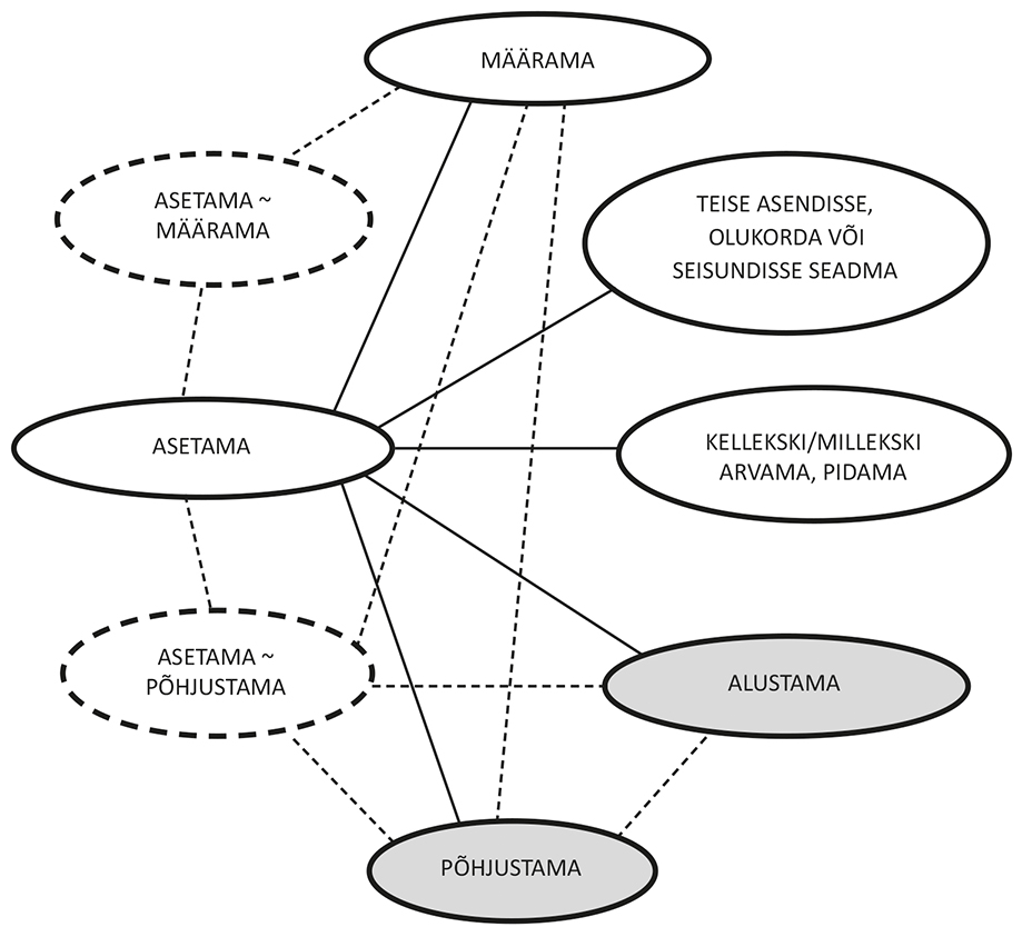 Joonisel 2 on kujutatud panema-verbi leksikaalsete ja grammatiliste tähendusrühmade omavahelised seosed. Iga tähendusrühma alla kuulub väiksem või suurem hulk panema-verbi kitsamaid kasutusi, sh kuuluvad tähendusrühmadesse ka kujundlikud kasutusjuhud. Pideva joonega on tähistatud panema-verbi põhitähendused ja katkendliku joonega mitmese tähendusega sildkonstruktsioonid. Jooned rühmade vahel näitavad tähendusseoseid: keskne asetamistähendus on seotud kõikide teiste tähendustega.
