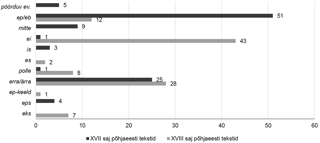 XVII–XVIII sajandi põhjaeesti autorite teostes leiduvate kõigi partikliliste eitustarindite osakaal protsentides on näha joonisel 1. Andmaks selgemat pilti nende esinemisest, on arvestatud eitussõnade ja -vormide – ep/eb, pöörduv eitusverb, ei, is, es, polle, erra/ärra, ep­-keeld, eps ja eks – hulka ka konstruktsioonid, kus need esinevad koos partikliga mitte.