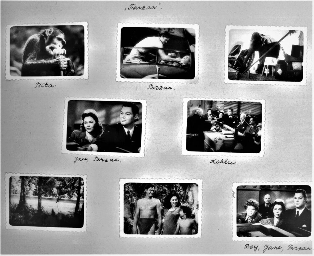 8. Peale Tarzani filmi leidub albumis veel fotosid India filmidest, teistest Ameerikas toodetud trofeefilmidest ja näitlejatest, aga ka Nõukogude filminäitlejatest nagu Ljubov Orlova, ­Pavel ­Kadotšnikov jt; eesti- ja venekeelsete allkirjadega fotod Estonia teatri ooperitest „Jevgeni ­Onegin”, „Noor kaardivägi” ja näitlejatest (Elsa Maasik, Georg Ots jt).