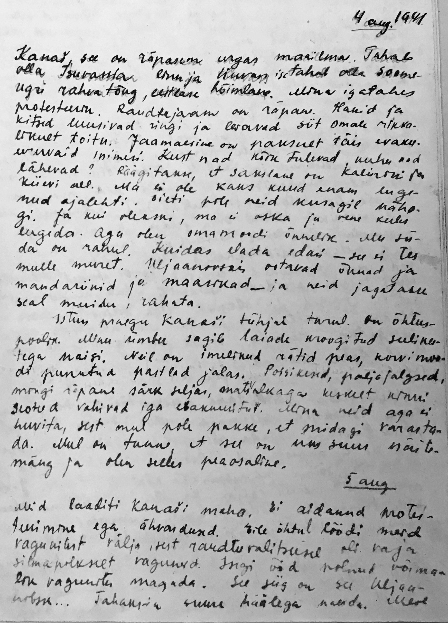 Ta [brigadir] ei saa aru, et Friida ei saa töötada, kuna ta kannab seitsmendat kuud. Esimees ütleb, et põllul on parem sünnitada. Ainult lõunavaheajal. Siga ja elajas [—] Meid kahte ta ei puutu, aga Juulit püüab alati käperdada. Friida ei saa leiba. Miks jäetakse rase naine N Liidus hooleta ja leivata? Kas me oleme sattunud hullumajja? Mis koht on St[araja] Maina? Kas see on sabotaažnikkude pesa? Ei ole, kes vastaks me küsimustele. (RA, ERAF.79.1.37, l 22)