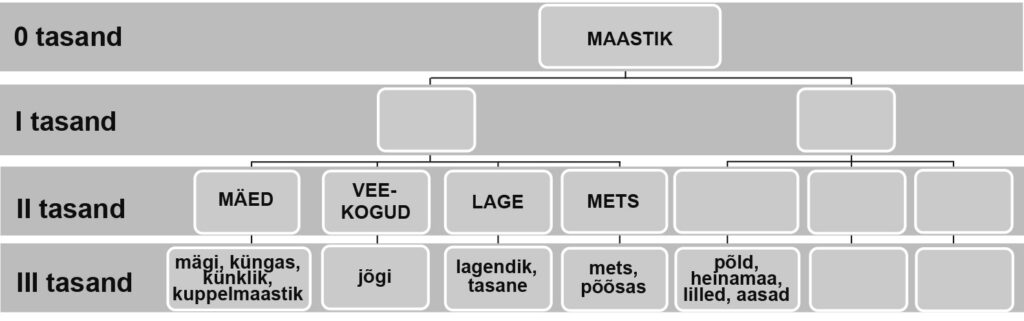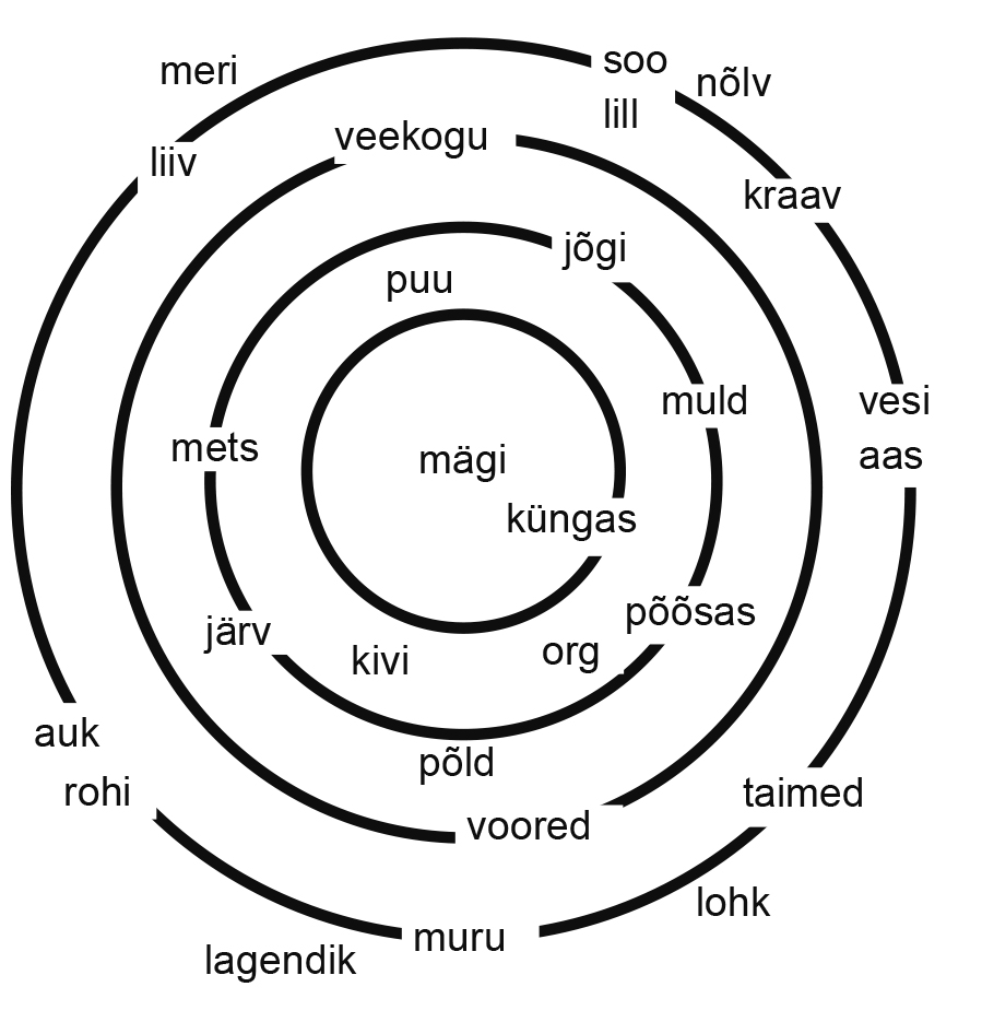 Artikli eesmärk on välja selgitada, kuidas keelekõneleja maastikku tajub ja enda jaoks keeliselt kaardistab3 ehk kuidas inimesed maastikust räägivad. Kasutame kahte erinevat välimeetodit: vaba moodustuse katset ehk etteantud loetelukatse küsimusi (Jürine jt 2013; Uusküla 2018) ja poolstruktureeritud intervjuud (Laherand 2010). Keelejuhtideks4 on erineva sotsiokultuurilise taustaga eesti keelt emakeelena kõnelevad isikud. Tahame teada, milliseid sõnu kasutatakse maastikust rääkides, kui ette on antud loetelukatse küsimused või algtakson (ingl unique beginner; Berlin 1992). Taksonoomia kujutab endast ühe semantilise välja hierarhilistes suhetes olevate üksuste ehk taksonite süsteemi, kus eri astmed tähistavad hargmiku erinevaid liigitusi. Taksonoomias selguvad ühe tähendusvälja sõnade ja mõistete suhted selle konkreetse tähendusvälja sees (Brown 1977, 1984). Selgitame välja, kas maastiku­sõnavara moodustab ühtse semantilise välja, sarnaselt näiteks kehaosade või loomanimetustega. Vaatleme, kas maastikusõnade hulka kuuluvad ainult jõed, järved, mäed ja orud või mõtestavad tänapäeva eesti keele kõnelejad maastikku ka kui linnamaastikku ja nimetavad maju, parke, tänavaid jms.