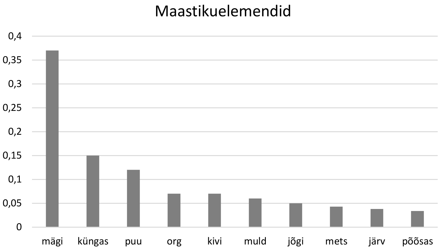 Küsimusele „nimeta maastikuelemente” vastati kokku 117 erineva sõnaga. Neist sagedasemad olid mägi (78, arv sõna järel näitab siin ja edaspidi sõna standardiseeritud sagedust), küngas (55) ja puu (35). Kui võrrelda tulemusi Smithi ja Marki (2001: 607) uurimuse tulemustega, siis oli samas küsimuses samuti esikohal mountain ’mägi’, mida nimetas 54 vastanust 48. Tabelis 1 on kümne enim nimetatud sõna hulgas eranditult kõik looduslikud maastikuelemendid. Inimtekkelisi maastiku­elemente nimetati vähe: hoone (5), park (4), maantee (2), ja vaid ühel korral mainiti sõnu maja, linn, mast, teeviit, tänav ja asfalt. Põllumajandusega seotud sõnu nimetati samuti vähe, nendest esinesid loeteludes vaid rohumaa, heinamaa ja põld. Valdava osa sõnadest moodustavad maastikul silmaga nähtavad ja eristuvad elemendid, omaette alajaotuses on pinnastikuga seotud sõnad muld, savi, liiv, kruus, asfalt, pind ja pinnas, kuid need jäävad prototüübiteooria kontekstis pigem kategooria perifeeriasse, sest nende nimetamissagedus on väike ja nad ei meenu keelejuhtidele esimeste hulgas. Joonisel 1 on näha, kui palju rohkem sõna mägi teistest maastikusõnadest kognitiivselt esildub.
