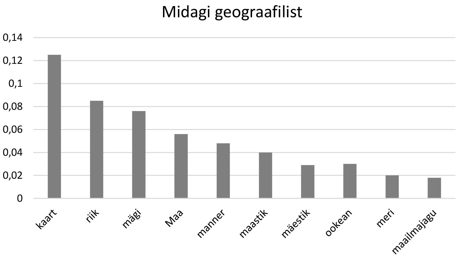 Küsimusele „nimeta midagi geograafilist” anti kokku 179 erinevat vastust, seega olid vastused küsimusele „nimeta maastikuelemente” üksmeelsemad. Vastustest kerkisid esile sõnad riik (29), kaart (27) ja mägi (21). Kognitiivse esilduvuse järgi on selle küsimuse ülekaalukalt esilduvaim kaart (S = 0,124). Huvitav on see, et sellele küsimusele vastates mainiti kümnel korral ka sõna maastik (S = 0,041). Nimetatud on maailmajagusid Aasia, Aafrika, Euroopa; riikide nimesid Venemaa, Eesti, Läti, Leedu, Soome, Tiibet, Itaalia ja Gruusia; mägesid Mount Everest ja Kilimandžaro. Osa keele­juhtide jaoks seostub see küsimus otseselt koolitunniga ja nimetati sõnu õppeaine, õppefilm, aga ka Google Maps ja ENE. Smithi ja Marki (2001: 608) hinnangul on selline küsimuse sõnastus kõige üldisem ning peaks kõige paremini esile tooma geograafia valdkonda kirjeldavaid sõnu. Selgus, et tegelikult olid vastustes esindatud ka need sõnad, mis esildusid teiste küsimuste all, ja suurt erinevust välja ei joonistunud. Sellised sõnad nagu mountain ’mägi’, lake ’järv’, river ’jõgi’ ja ocean ’ookean’ esinesid Smithi ja Marki uurimuses küll väiksema sagedusega, aga olid ometi loeteludes olemas. Mägi ja ookean mahuvad ka eesti keelejuhtide kümne loetletuma sõna hulka. Samuti on sarnasus sõnaga map ’kaart’, mis eesti uurimuses oli suisa teisel kohal. Huvitav ühine joon on ka Maa ’The world’ esinemine selles loetelukatse küsimuses, mis ainsana nii inglise- kui ka eestikeelses uurimuses sageduselt silma paistis. Joonis 2 iseloomustab sellele küsimusele antud vastuste esiletulekut visuaalselt.