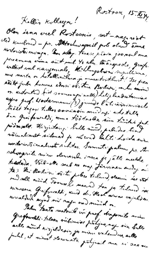 1 Saareste töötas 1944. aastal eraõpetlasena Greifswaldi Põhja Instituudis (Nordisches Institut) (Raag 1997: 7, 455). Kirjandusmuuseumi kultuuriloolises arhiivis on seitse Louis Hjelmslev’ prantsuskeelset kirja Saarestele, neist esimene on 13. detsembrist 1944, teine 23. jaanuarist 1945 ja mõlemad saadetud Greifswaldi aadressil Bahnhof-Strasse 33-34, kus Saareste tol ajal oletatavasti pidi viibima (EKM EKLA, f 254, m 19:19, l 23/24).