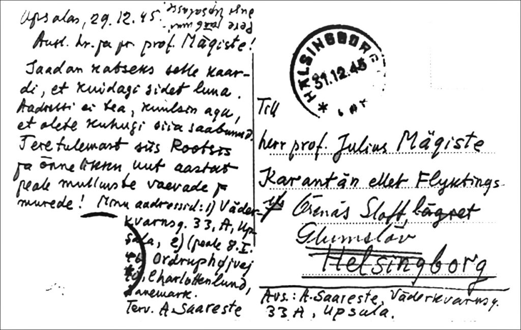 J o o n i s 2. Andrus Saareste postkaart Uppsalast (29. XII 1945, EKM EKLA, f 340, m 30:23).