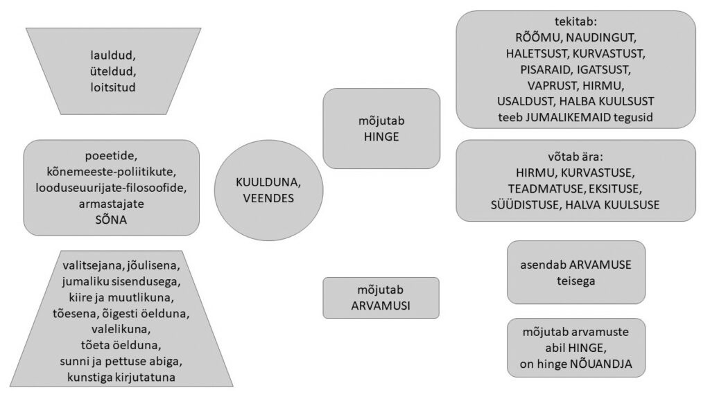 Kõne keskne argument rõhutabki võimu ehk väge (δύναμις), mida hinge ja selle arvamuste üle saavutatakse põhitajude kaudu: nägemismeele kaudu mõjutavad hinge kujutav kunst (skulptuur ja maal/graafika14) ning sõjas ja armastuses ka „päris” kehad, kuulmismeele puhul vaid taideline kõne, sealhulgas luule/laul, loits, teadlaste, poliitikute, filosoofide arutlused. Kui kunstiteooria rõhutab jäljendamist ja illusoorsust ning retoorikatraditsioon kõne võimu,15 siis strukturalistlik analüüs annab skeemi,16 mille lähtepunkt on jumaliku jõuga, sisenduslik, kohati lausa hullunud sõna/kõne (λόγος), mis lauldu, loitsitu või kõnelduna, kuulmise kaudu ja hinges olevate arvamustega kombineerudes mõjutab (veenab) hinge, tehes seda paratamatult, sunniga, sageli pettes ja ilma tõeta kirjutatuna, tuues kaasa või võttes ära hirmu, valu ja vaeva, kaastunde, igatsuse, naudingu ja rõõmu ning tekitades isegi hullumeelsust (vt joonist 1). Sõnakunst, vaatepilt, füüsiline vägivald ja võlurohud on analoogiasuhtes mõju kaudu.
