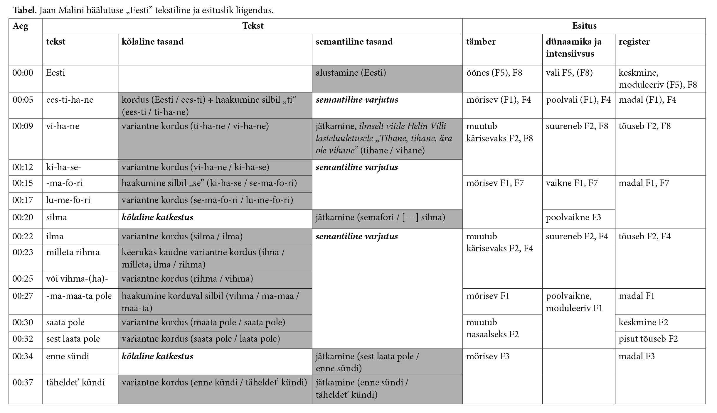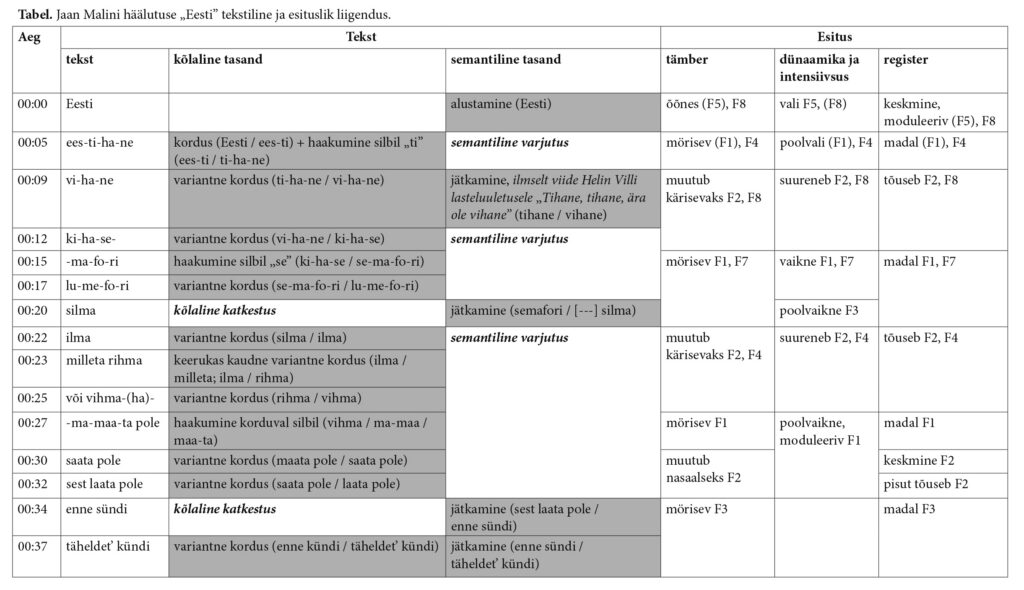 Malini häälutuste teksti kõlaline ja semantiline tasand suhestuvad omavahel kõlalise katkestuse ja semantilise varjutuse kaudu. K õ l a l i n e k a t k e s t u s on ühel kõlamudelil põhineva tekstiüksuse asendamine teistsugusel mudelil põhineva üksusega, mis võimaldab teksti arengu pidevuse tagajana esile tulla teksti semantilisel tasandil. Sellisena vastandub see variantsele kordusele, milles iga järgnev värss põhineb sarnasel kõlamudelil ning mis sellisena võib põhjustada hoopis s e m a n t i l i s e v a r j u t u s e, st teksti tähendusliku aspekti taandumise. Viimane on küll võimalik ainult siis, kui üksteisele järgnevate üksuste (värsside) vahel ei moodustu sidusat ning üheselt mõistetavat mõtet.2 Kui selline mõte siiski moodustub, siis ei põhjusta variantne kordus semantilist varjutust ning teksti arengu pidevuse tagavad nii kõlaline kui ka semantiline tasand. Teksti toimimist erinevatel tasanditel demonstreerib video põhjal (Malin 2016) koostatud Malini häälutuse „Eesti” tabel.