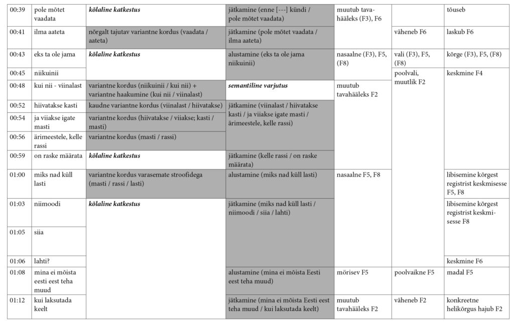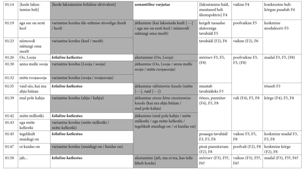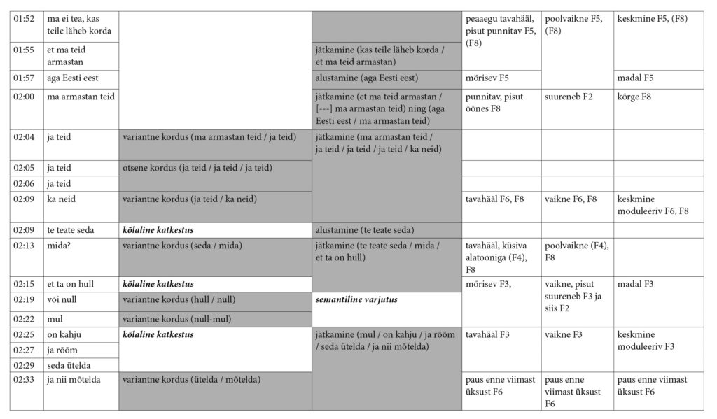 Tabelist ilmneb, et sageli on esitusega seotud nii tämbri, dünaamika kui ka registri osa muutused samaaegsed, kuid mitte alati pole sedalaadi retooriline esiletõste seotud vormilise liigenduskohaga. Sellest tuleneb, et häälutuse vormiline ülesehitus ei ole avatav puhtalt esituse pinnal. Teisalt ei ole see käsitletav ka ainult häälutuse verbaalsest struktuurist – näiteks kõlalisest katkestusest või semantilisest varjutusest – lähtuvalt, sest ei ühe ega teise olemasolu ei artikuleeri alati nähtust, mida saaks intuitiivselt tajuda vormilise tsesuurina. Näib, et viimase tekkimiseks on vajalik teatavate tingimuste samaaegne täitmine nii verbaalsel kui ka esituslikul pinnal.