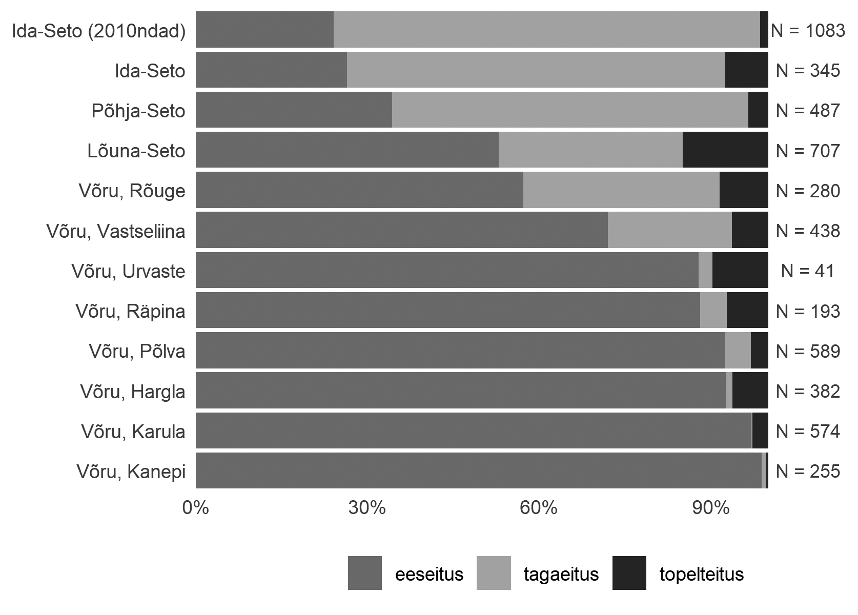 Esmalt vaatleme suhteliste kasutussageduste põhjal, mis on ees-, taga- ja topelteituse vahekorrad võru-seto keelealal (joonis 1). Tagaeituse osakaalu illustreerib ka sageduskaart (joonis 2), mis sisaldab vaid EMK andmeid, st välja on jäetud idaseto 2010-ndate andmestik.