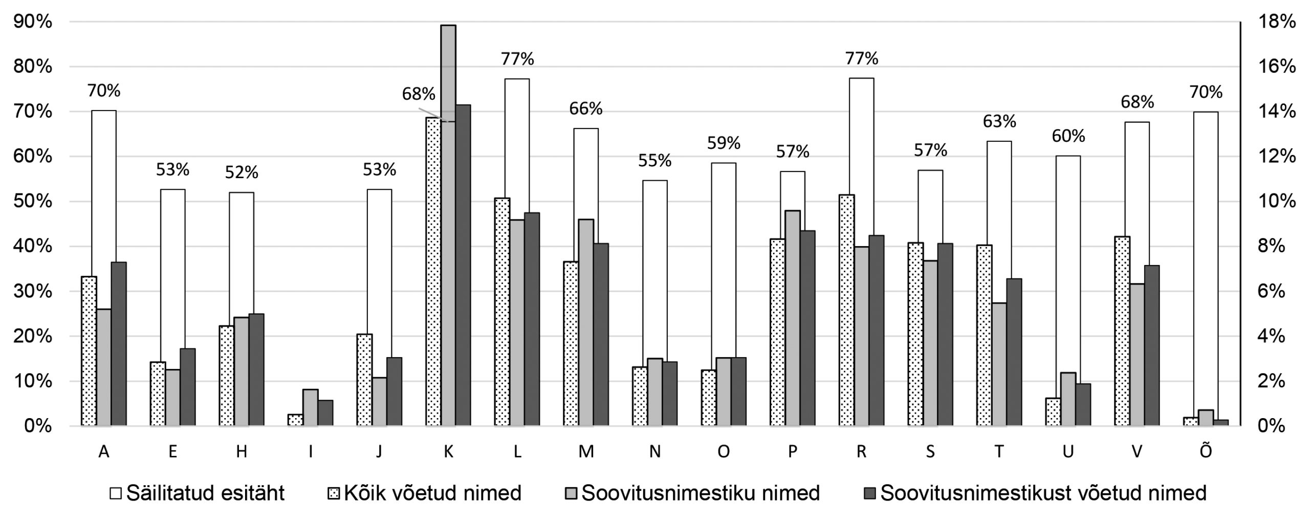 Võetud nimedest kattub esitäht vana nimega 56,8%-l kordadest. Enim on esitähe säilitanud r– (77,4%) ja l-algulised (77,3%) nimed, alla poole kordadest on säilinud esitähed b, d, f, i, ä, ö ja ü. Esitähe säilitamise tendents kasvas aasta-aastalt.
