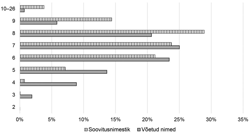 69% võttis endale 6–8-tähelise nime, sh veerand muutjatest võttis endale seitsmetähelise nime. Iseloomulik näide esitähe säilitamisest ning uue, k-algulise ja seitsmetähelise nime võtmisest on muutus Kakason > Kaljula.