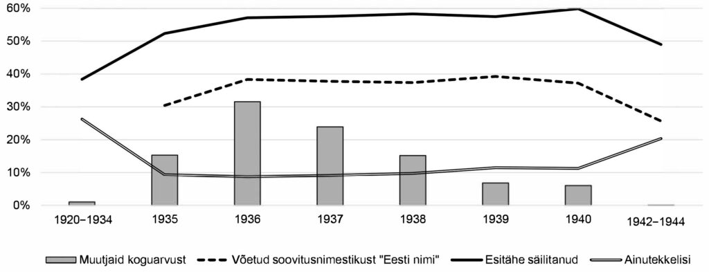 Tabelis 1 on toodud eelnimetatud arvutused ning võrdlusandmed kaasaegse statistikaga. Autoril on õnnestunud leida vaid üks, Edgar Rajandi koostatud mustanddokument 1940. aasta kevadest, kus on toodud andmed 1939. aasta lõpuni ning seda nii sooviavalduste kui ka otsuste kohta.9 Andmed pole aastati küll täpselt võrreldavad, sest otsused avaldati RTL-is viivitusega ning andmebaasis on avaldamise kuupäev. Andmeridu on seega kolm: sooviavaldused, otsused ning otsuste avaldamised. Erinevus arvutusliku ja tegeliku tulemuse vahel perioodi 1920–1934 kohta on selgitatav sellega, et arvutuslikust tulemusest on välja jäetud rööpnimede kaotamise otsused, mis mõjutavad selle perioodi lõpptulemust oluliselt. Aastail 1935–1936 on näha sooviavalduste palju suurem hulk võrreldes muutmisotsustega ning on loomulik, et just sel põhjusel kasutati avalikkuses neist esimest arvu argumendina kõhklejate ärgitamiseks. Alles hiljem hakati avaldama tõepärasemat otsuste statistikat. Siiski jätkus isikute arvu saamiseks otsuste üldarvu korrutamine 2,5-ga.