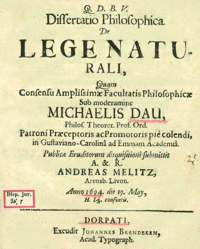Pilt 1. Dissertatsioon loomuõigusest, mis kaitsti Michael Dau eesistumisel 1694. aastal Tartus. Foto allikas: Landesbibliothek Mecklenburg-Vorpommern.