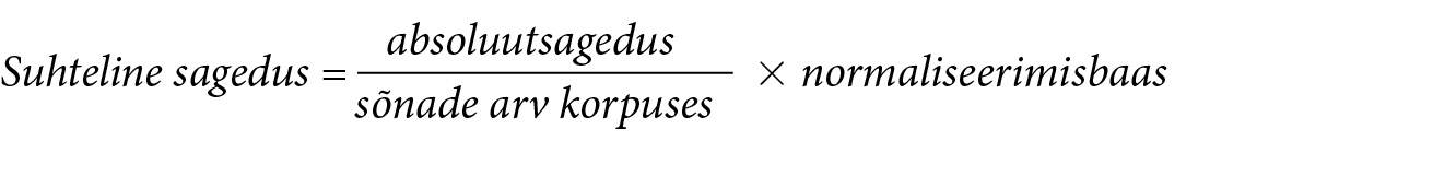 Et vaadelda sõnesageduste võimalikke muutusi, kasutasin peale absoluutsageduse suhtelist ehk normaliseeritud sagedust, mis võimaldab võrrelda sagedusi kahe erineva suurusega korpuse vahel. Suhtelise sageduse arvutamiseks kasutasin valemit (Brezina 2018: 43):