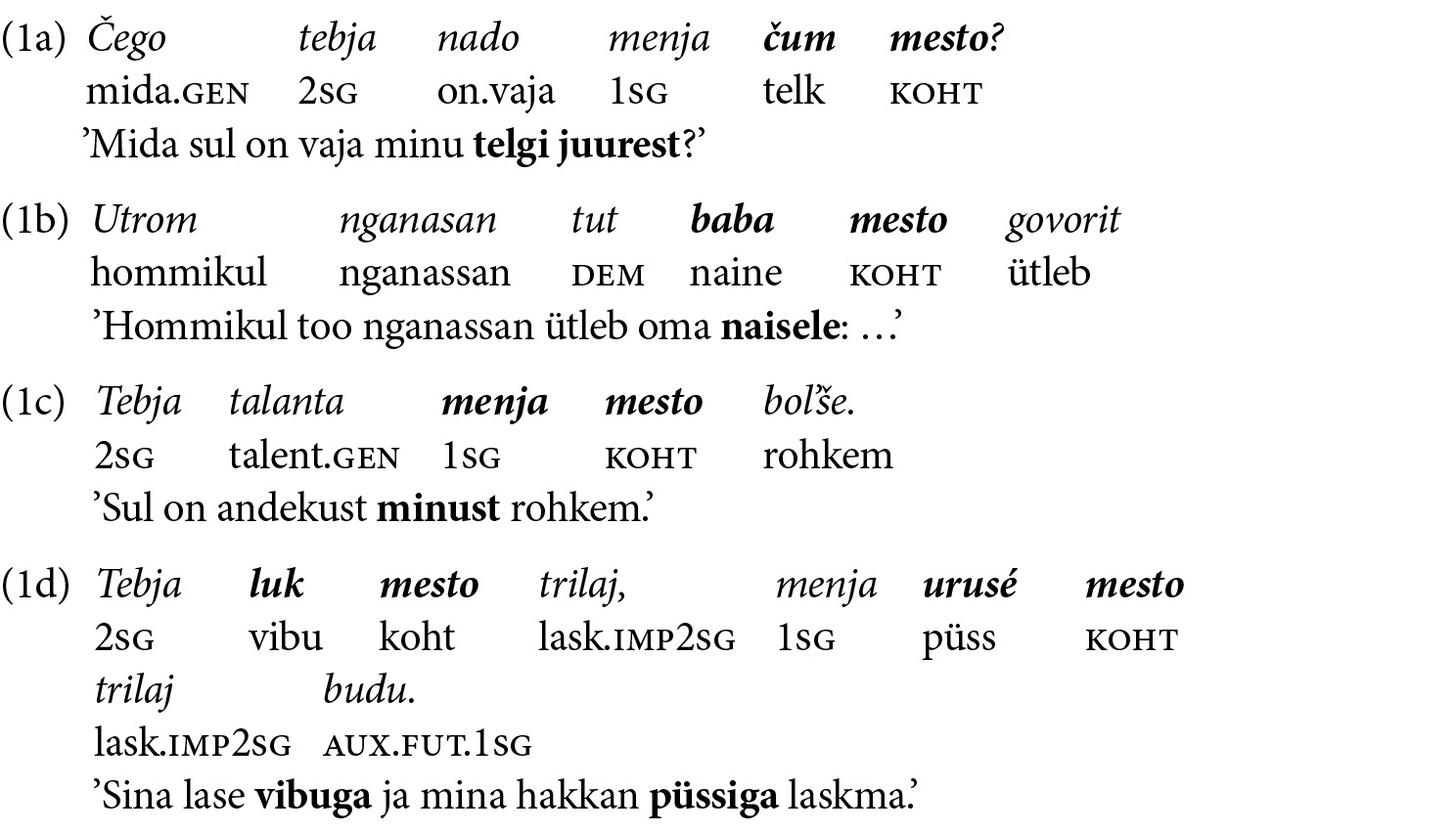 Kõige lähemal väikese keele mõistele on tõenäoliselt keel, mis on mingil põhjusel piiratud. Üks selliste keelte tüüp on pidžin, st segakeel, mis tekib eri keelte kokkupuutel, enamasti kaubanduslikuks suhtluseks. Peter Trudgilli (2011: 67) definitsioonis sisaldab mõne lähtekeele pidžineerumine lihtsustamist, segunemist ja vähendamist, kusjuures vähendamine tähendab, et sõnavara on väiksem kui emakeelena kõnelejatel ja tavaliselt on grammatilisi markereid vähem, samas süntaktiliste struktuuride ning stiilide valik on kitsam. Eesti Vikipeedia toob näite: „Tüüpiline on, et nimisõnad ei käändu ja tegusõnad ei pöördu. Kui nt eesti keeles öeldakse: Poiss ütles, et läheb koju, siis eesti pidžinis öeldakse sama lause: Poiss ütlema minema kodu.” (Vikipeedia: pidžin) Sõnad on samad, aga tegusõnad on konjugeerimata, samas seisab adverbi koju asemel käänamata nimisõna kodu ning lausestruktuur on lihtsustatud nii, et kaks predikaati – kõne­predikaat ja laiend – seisavad kõrvuti ilma ühegi alistava sidesõnata. Ma ei ole kindel, mida „eesti pidžin” täpselt tähendab, tuntum näide on mulle govorka, Taimõri poolsaare pidžin, mida kirjeldasid Eugen Helimski (Xelimskij 1996; Helimskij 2000) ja Dieter Stern (2005, 2012). Selle pidžini leksifikaator oli vene keel: vene kaupmehed kasutasid seda nganassaani, dolgaani, neenetsi ja eenetsi põlis­rahvastega kokku puutudes. Govorka morfosüntaksis esinevad selged lihtsustused, nt pole soolist eristamist, isikulisi asesõnu kasutatakse üldistatud omastava vormis menja, tebja jne (näited 1a, 1c–1d), käänete eristamise asemel on kaks järelsõna: meste ’koos’ ja mesto ’koht’. Viimane täidab lokatiivi (1a), latiivi (1b), ablatiivi (1c), instrumentaali (1d) ja muid funktsioone (Stern 2005: 301).
