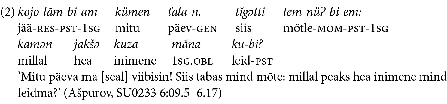 Minu uuritud keel, mida algusosas mainisin, on kamassi keel. Selle keele kohta teatas 1926. aastal Arkadi Tugarinov, et „[Abalakovo] külas on kokku 32 talu, millest 20 kuuluvad kamasside järglastele. Üheksast majast võib leida inimesi, kes räägivad „taiga” keelt, st samojeedi keelt, seitsmes räägivad nad „stepi” keelt, mis tähendab katša türgi keelt. Mõnes peres räägib üks osa perest taiga keelt ja teine osa stepi keelt. Küsimusele, kas nad saavad teineteisest aru, vastasid nad: „Ma kuulen (st saan aru), aga ma ei saa rääkida.” Taiga kõnelejad selgitasid, et „meie keel on pagana raske, pead kokutama”. Muidugi räägivad kõik suurepäraselt vene keelt, noored räägivad ainult vene keelt, vanemate keelt nad ei „kuule”.” (Tugarinov 1926: 83) Kui keel on sellises olukorras, siis on hästi, et keel sai dokumenteeritud enne kadumist. Enne Tugarinovi on Abalakovos käinud M. A. Castrén (1847) ja Kai Donner (1912 ja 1914; vt Joki 1944). „Lugu metsast” on üks neljast säilinud kamassi fonograafi salvestisest, mille Donner tegi Abalakovo külas 1914. aasta augustis.2 Näites 2 tsiteerin ühte lauset kamass Innokenti Ašpurovi loost.