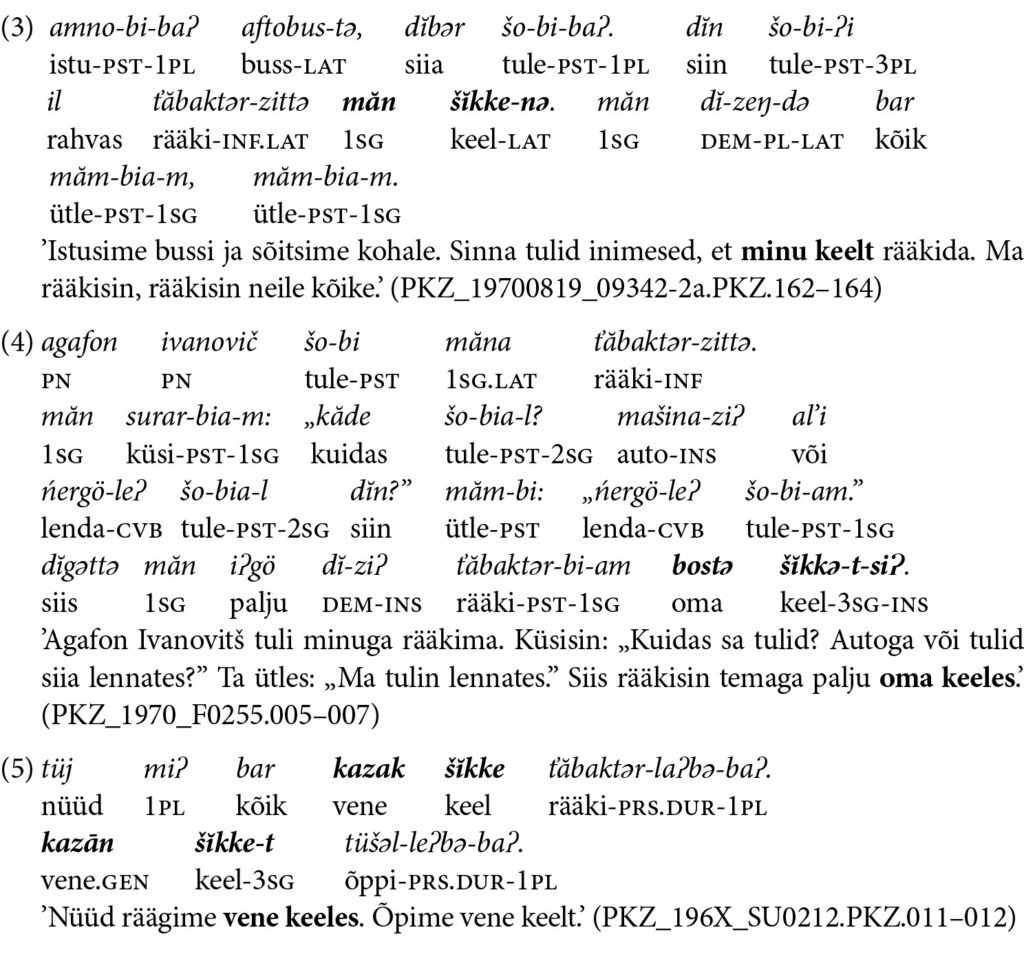 Fraasi ’rääkima omas või vene keeles’ jaoks kasutab Plotnikova kolme erinevat varianti: šĭkkenə (näide 3), mis on šĭke ’keel’ latiivi käändes, šĭkkətsiɁ (4), mis on instrumentaal kolmanda pöörde possessiivsufiksiga (NB: mitte esimeses pöördes), ja markeerimata sihitisega vormi šĭkket (näide 5). Küsimus on, kas see varieerumine tähendab midagi. Korpuses esineb sõna šĭkke ’keel’ sihitisena verbidega, mille tähendus on ’teadma’, ’õppima’ või ’mõistma’ (7 korda), ainuke juhtum verbiga ’rääkima’ on aga näide 5. Nii selle verbiga kui ka verbidega ’ütlema’, ’jutustama’ ja ka ’laulma’ esineb sõna šĭkke ’keel’ üldiselt instrumentaali käändes (11 korda), nagu näites 4, latiivis aga ainult üks kord (näide 3). Selgitada võiks seda varianti vene keele mõjuga, kui Plotnikova tõlkis vene keele prepositsiooni (na jazõkom) kamassi keele latiiviga (kuigi pigem oleks oodatud vaste kamassi lokatiiv šĭkke-gən). Küsides, kuidas varasemad dokumenteeritud kõnelejad neid tähendusi väljendasid, vastust kahjuks ei saa: vanemates allikates pole sellist konstruktsiooni üles märgitud.