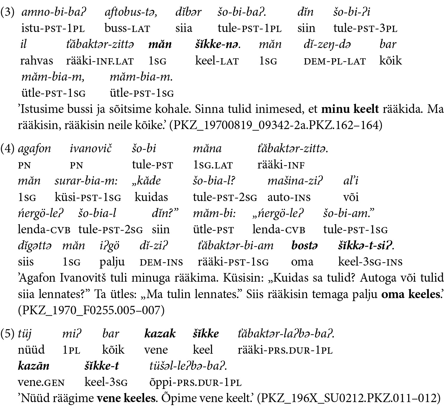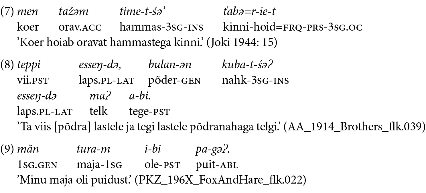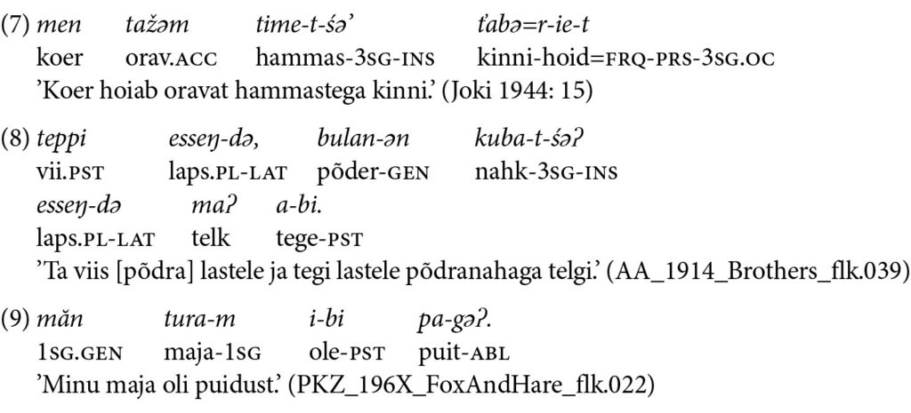 Näites 5 esineb teinegi varieeruvus: vormid kazak šĭkke ja kazān šĭkke ’vene keel’. Teine, genitiiviga vorm on õige, kuna see on registreeritud varem, kuid puudub possessiivsufiks, vrd nt kazān šĭkke-t (vene.GEN keel-3SG) ’vene keel’, nu-zan šĭkke-t (tatar-PL.GEN keel-3SG) ’tatari (põlisrahva) keel’ (Joki 1944: 63).