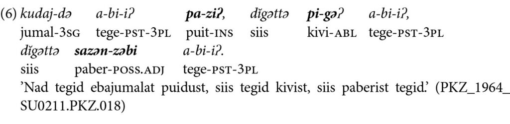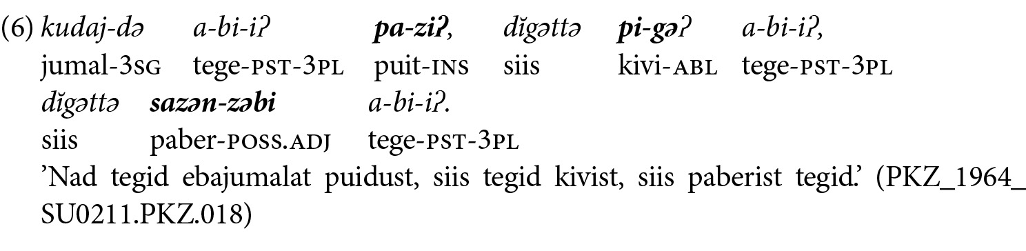 3 Ka adjektiiv annab põhjust järelemõtlemiseks, sest possessiivne adjektiiv tunnusega -zəbi ­tegelikut ei ole sobiv vorm. Materjali väljendamiseks kasutati j-tunnusega adjektiivi, vrd nt pa-j šamnak ’puidust lusikas’ (Joki 1944: 50) või baza-j aspaʔ ’rauast pada’ (Joki 1944: 8), kuid -zəbi tähendab, et kellel või millel on midagi, nt pa-zəbi aʔťi ’metsatee’, sagər ine-zəbi kuza ’musta ­hobusega inimene’ (Joki 1944: 51). Lisaks tekib küsimus, kas on üldse võimalik possessiivset adjektiivi sihitisena kasutada (vrd Klumpp 2016: 64–65, 2022b: 836–837).