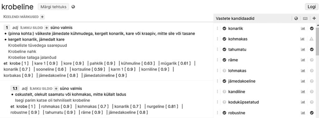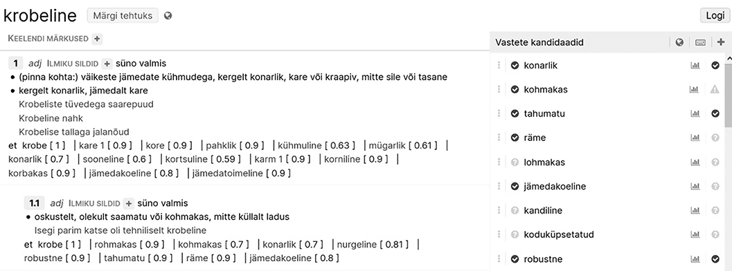 Valimi sõnad pärinevad „EKI ühendsõnastikust 2020” ja „Eesti keele ühendkorpusest 2019”. Analüüsis nendest pärit sõnu eraldi ei käsitletud, kuna eesmärk oli uurida kompimisadjektiivide rühma tervikuna. ÜS on EKI andmebaas, mida koostatakse, toimetatakse ja täiendatakse pidevalt. ÜS-i eesmärk on koondada erinevaid sõnastikke ja keeleandmeid, et kasutajal oleks võimalik saada kogu info kätte ühest kohast (Tavast jt 2020). Kompimisadjektiive aitas ÜS-i märksõnade hulgast välja sõeluda sünonüümide tööriist (joonis 1). EKI leksikograafid töötavad Ekilexi andmebaasis (vt Tavast jt 2018), kus sünonüümide kihi koostamisel on abiks automaatselt genereeritud sünonüümikandidaatide loend (joonisel paremas servas). Tähenduste all on näha leksikograafi valikud. Kandidaadid on ekstraheeritud teistest andmebaasis sisalduvatest sõnaraamatutest, kaasa arvatud ÜS-i enda definitsiooniridadelt. Kasutatud on ka semantilist peegeldamist ja distributiivse sarnasuse arvutamist korpuse põhjal (vt Tavast jt 2020). Kandidaatide loend võimaldab uurida semantiliselt sarnaseid sõnu ja leida valimisse potentsiaalselt sobivaid, mille tähendust hiljem ­korpusanalüüsiga täpsustada.