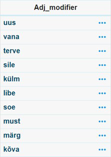 Osa valimi sõnadest on pärit ÜK 2019-st, mis sisaldab üle 1,5 miljardi sõne. Et võimaldada paremat lingvistilist analüüsi, on korpus lemmatiseeritud, märgendatud ja ühestatud analüsaatori EstNLTK versiooniga 1.6 (Laur jt 2020). Korpusest kompimisadjektiivide leidmiseks kasutasin leksikograafilise tarkvara Sketch Engine (­Kilgarriff jt 2014) sõnavisandite ja distributiivse tesauruse funktsiooni. Sõna­visandid esitavad sõna kollokatsioone ja võimaldavad otsida kompimisadjektiive näiteks kompimiseks sobivate substantiivide kaudu (joonis 2) või teiste kompimisadjektiivide ja/või suhte abil (joonis 3).