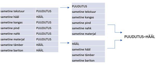 Tähendusvahelduste kaardistamiseks uurisin korpuspäringu programmi ­Sketch Engine sõnavisanditest (Kilgarriff jt 2010; eestikeelse mooduli kohta vt Kallas 2013) peamiselt adjektiivi ja substantiivi kollokatsioone (nt nüri nuga, nüri töö), adjektiivi ja verbi kollokatsioone (nt nüriks minema, nüriks kiskuma) ning ja/või-suhet (nt igav ja nüri, terav või nüri), milles avaldub nii sünonüümia, kaashüponüümia kui ka antonüümia. Selleks et tähendused ja tähendusvaheldused oleksid omavahel võrreldavad, lisasin adjektiividele korpuse kollokatsioonide (ja konkordantside) põhjal semantilisi tüüpe (joonis 5). Joonisel 5 on esitatud fragment adjektiivi sametine semantilisest analüüsist: kollokatsioonide märgendamine semantiliste tüüpidega, kollokatsioonide koondamine semantiliste tüüpide alla ja tähendusvahelduse fikseerimine (meetodi ja analüüsi kohta vt täpsemalt Tuulik 2022).