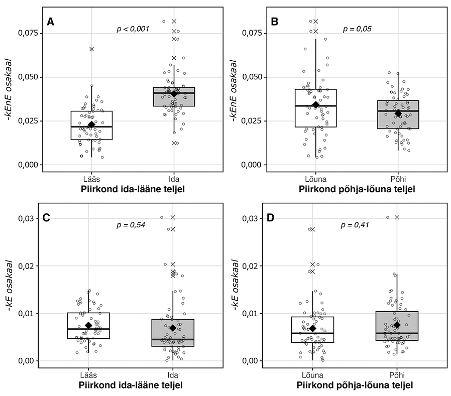 Piirkondlike mustrite täpsemaks väljaselgitamiseks jagasin Eesti alad geograafiliste koordinaatide mediaanide järgi neljaks: lääne- ja idapoolseteks ning põhja- ja lõunapoolseteks piirkondadeks. Selle jaotuse põhjal tehtud analüüs (joonis 3) näitas, et –kEnE DVSS on suurem Eesti ida- ja lõunaosas, kuigi ka mediaanist veidi põhja pool leidub kõrge DVSS-iga kihelkondi (nt Palamuse ja Maarja-Magdaleena) ning lõunas madalama DVSS-iga alasid (Hargla, Karula). Statistiliselt oluline on ida- ja läänepiirkondade erinevus (p < 0,001). Põhja- ja lõunapiirkondade erinevused –kEnE kasutamises on piiripealse olulisusega (p = 0,05).