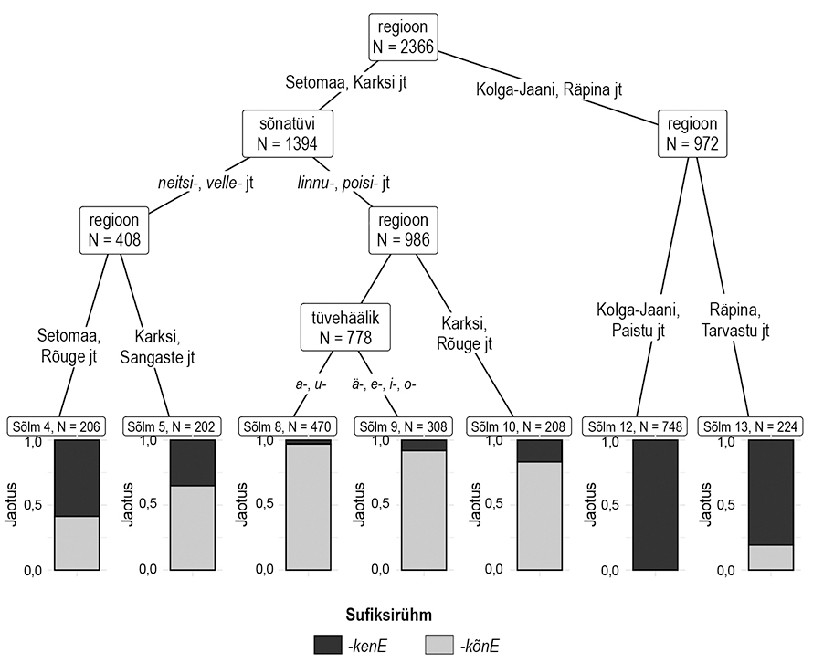 Keskendusin sagedusandmete analüüsile, mida on peetud oluliseks nii keele varieerumise kui ka murdekeelematerjali uurimisel (Lindström jt 2015: 51). Kombineerisin varieerumise analüüsi meetodeid sagedasemate näidete lähivaatlusega. kEnE-vormi varieerumist mõjutavate tegurite hindamiseks kasutasin otsustuspuu meetodit (Eriksen jt 2013), täpsemalt tingimusliku otsustuspuu algoritmi (Hothorn jt 2015).7 Analüüsisin andmeid tarkvara R (R Core Team 2022)8 ja Python (Python Software Foundation 2023) abil, kasutades paketti partykit (Hothorn, Zeileis 2015) ning visualiseerimiseks pakette ggplot2 (Wickham 2016), tm (Feinerer 2025), Pythoni teeke matplotlib (Hunter 2007) ja pandas (McKinney 2010) ning projekti FILTER kaardirakendust (FV).
