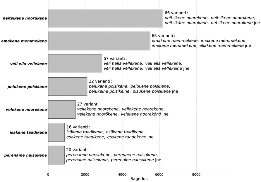 Tabel 2. Levinumad sufiksi -kEnE variandid regilaulutekstides koos ainsuse nominatiivivormide sagedusega.